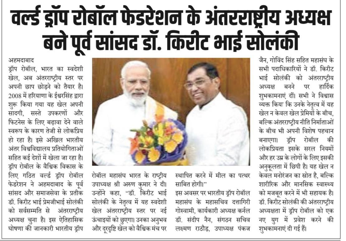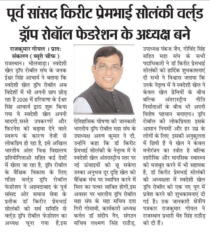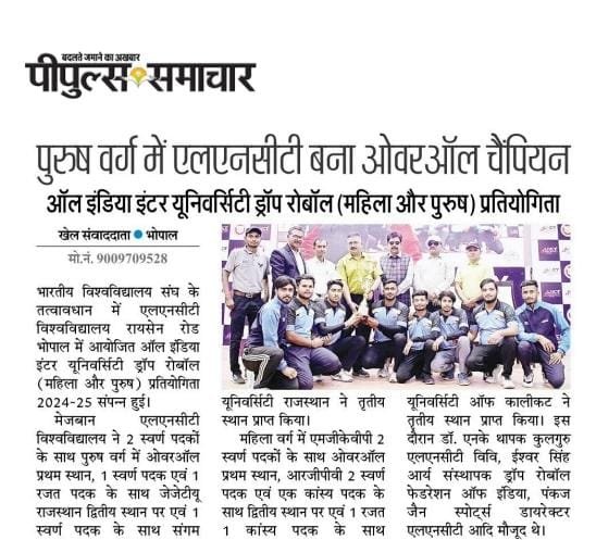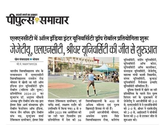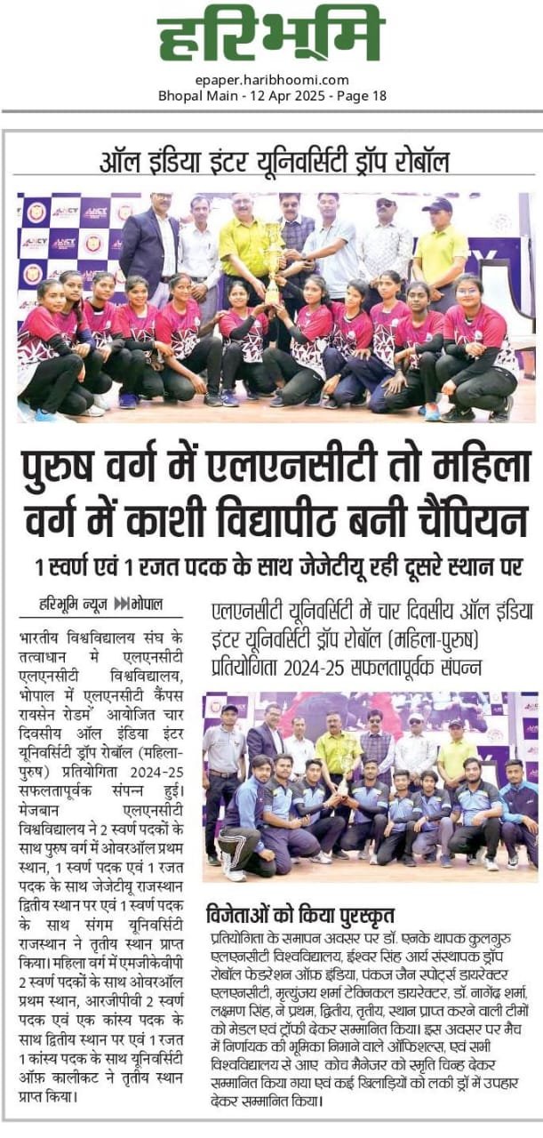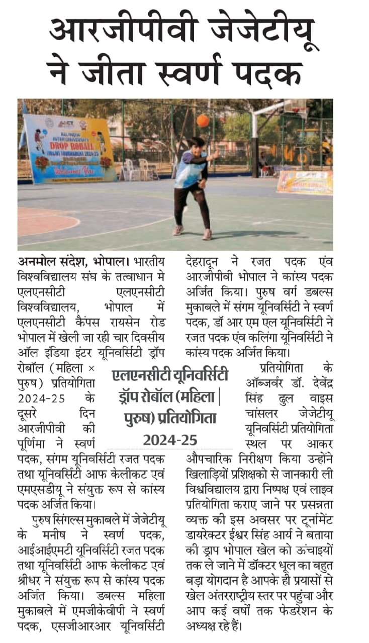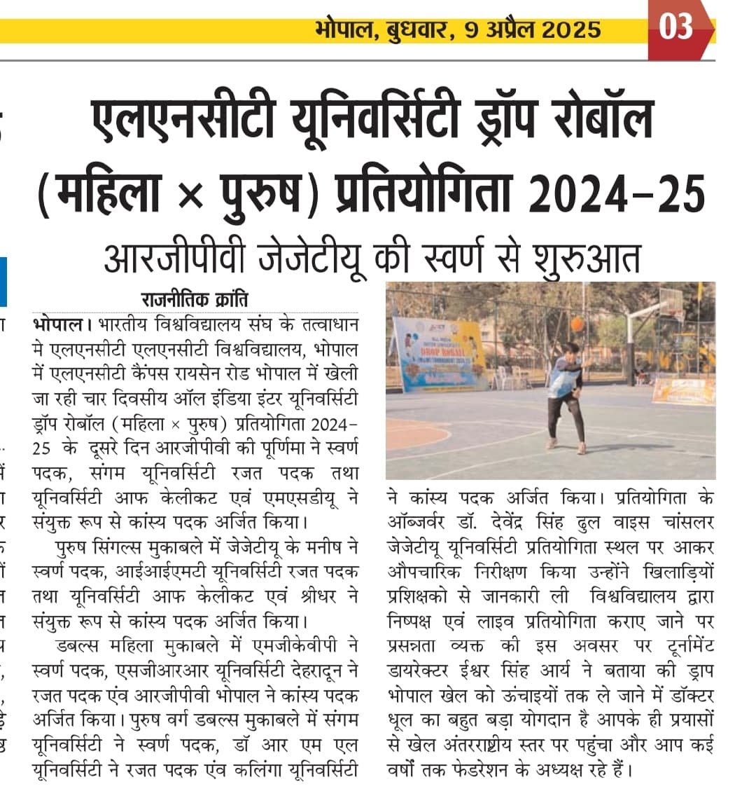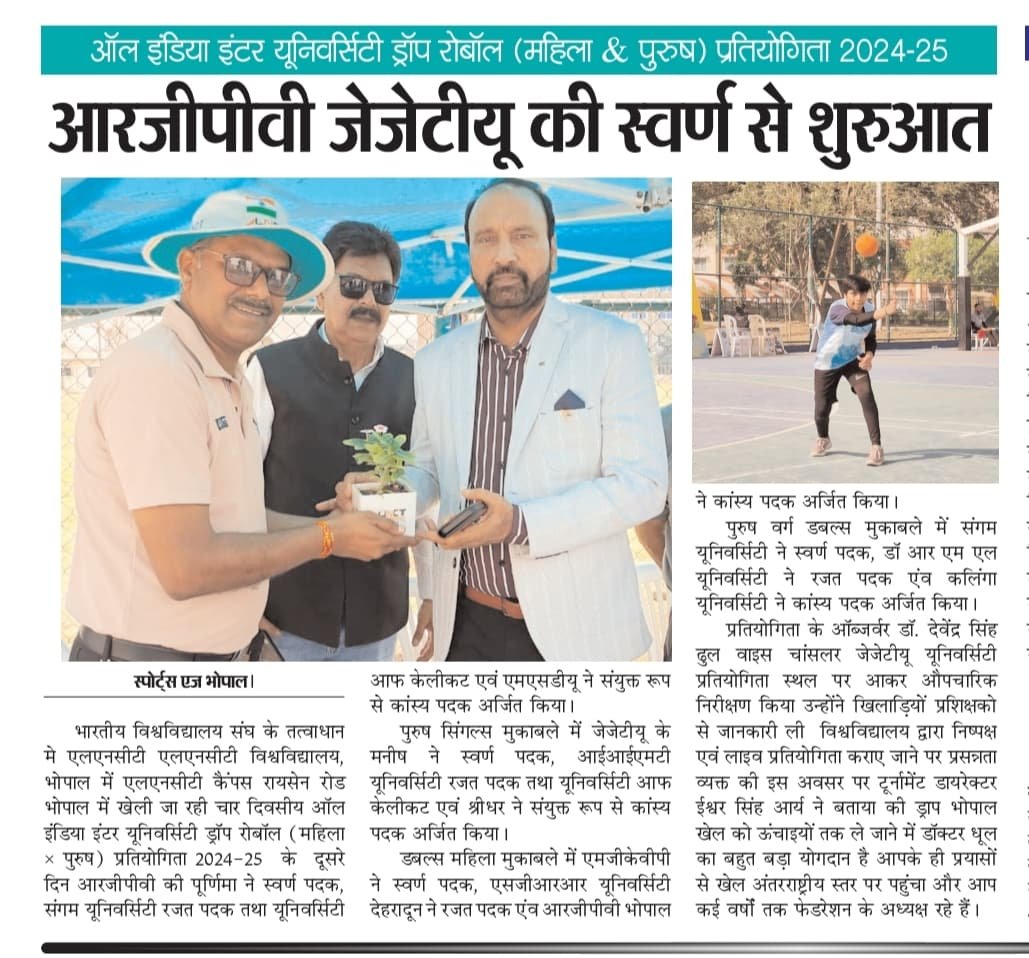 All India Inter University Drop Roball M/W Championship, LNCT University, Bhopal 15th Senior & 14th Junior and Sub Junior National Championship, 5-7 January 2025 ,Bihar 14th Senior National Championship, 29-31 March 2024 ,Kurukshetra, HR 13th Sub Junior and Junior Championship, 29 Sept to 2 Oct 2023 Ghaziabad, UP Inter University Drop Roball Championship MDU Rohtak 13th Senior National Championship ( 18 to 20 November, 2022 ) 12th Junior National Championship ( 28 to 30 May, 2022 ) 12th Senior & 11th Junior National Championship ( 28 to 31 Dec, 2021 ) 10th Sub Junior, 2nd Youth National Drop Roball Championship & 8th Federation Cup 2019-2020 11th Senior National Drop Roball Championship 2019-2020 1st Youth for 9th Junior National championship 2018-2019 8th Coaching Referee Seminar All India Inter-University Drop Roball Championship L.P.U, Jalandhar, Punjab 10th Senior National Championship All India Inter-University Drop Roball